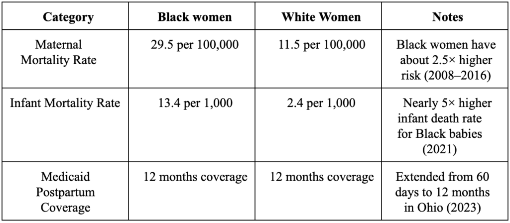 Maternal mortality, defined as the death of a woman during pregnancy or within one year of the end of pregnancy, is one of the clearest indicators of a region’s overall health and commitment to equity. It remains a persistent and alarming public health crisis, even in one of the wealthiest and most medically advanced countries in the world. Each year, hundreds of women in the United States die due to complications related to pregnancy and childbirth, many of which are entirely preventable. Despite advancements in medical technology and hospital systems, gaps in the quality and accessibility of maternal care remain. These gaps disproportionately affect Black women, who are over two times more likely to die from pregnancy-related causes than White women, regardless of income or education (Ohio Department of Health, 2023). Failing to address this issue leads not only to unnecessary deaths, but also severe health consequences (untreated pregnancy complications), social consequences (such as generational trauma and family instability), and financial consequences (such as higher emergency care costs and burdens on Medicaid and community programs).