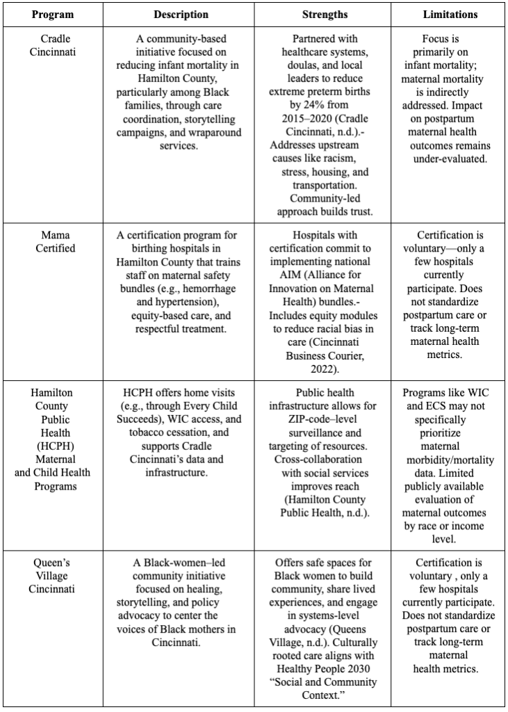 Table 2: Existing Maternal Health Programs in Hamilton County (Clifton, OH)