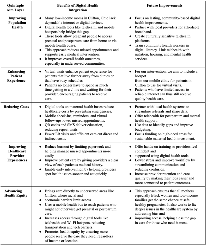 Our intervention was significantly shaped by our discussions with stakeholders, Chanetta Cottrell and Charla Hale. They both underlined that reducing maternal mortality requires addressing more extensive systemic gaps in access and education in addition to providing direct services. In communities like Clifton, Cottrell, of the Hamilton County Public Health Maternal and Infant Vitality Initiative, emphasized the effects of inadequate transportation and a lack of social support, pointing out that Medicaid transportation frequently falls short. To address this,her team links women with local navigators and resources, along with promoting hospital certifications that are doula-friendly.Healthy Moms and Babes President and CEO Hale described how the organization’s mobile unit integrates prenatal education, pregnancy testing, and case management with extended job and educational assistance for up to three years postpartum. This model demonstrates how sustained, community-based support can address gaps in maternal healthcare access while also mitigating socioeconomic barriers that influence maternal and infant outcomes. Through extending services beyond childbirth, the program promotes continuity of care, strengthens maternal stability, and recognizes the interdependence of health, education, and economic security in improving long-term family well-being. Strong collaborations with hospitals, Medicaid providers, and neighborhood organizations are the foundation of their success in attaining low infant mortality and high full-term birth rates. In order to effectively address maternal health disparities in underserved neighborhoods, these discussions collectively reaffirmed the significance of combining clinical services with community engagement, bias education, and resource accessibility.