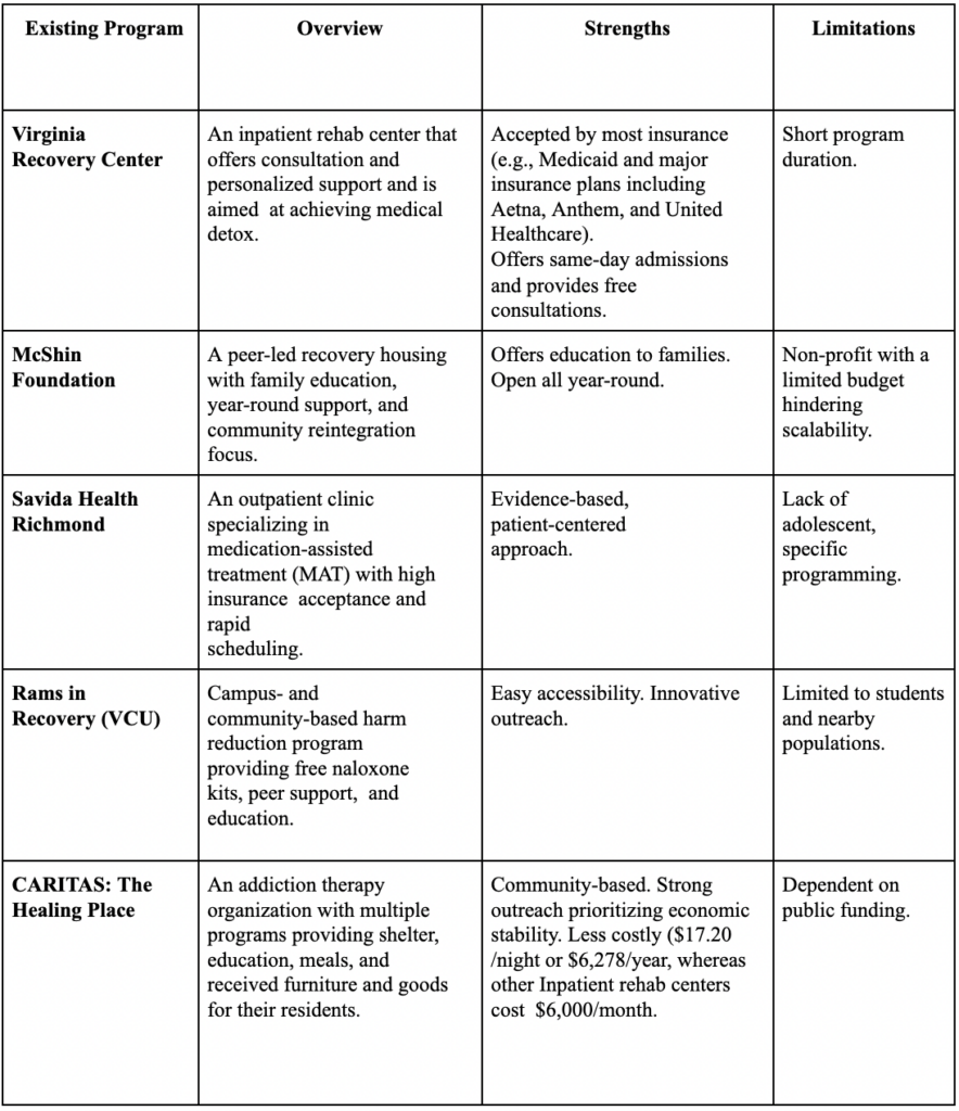 Table 1: Overview of Substance Abuse Programs for Youth and Young Adults in Richmond, VA