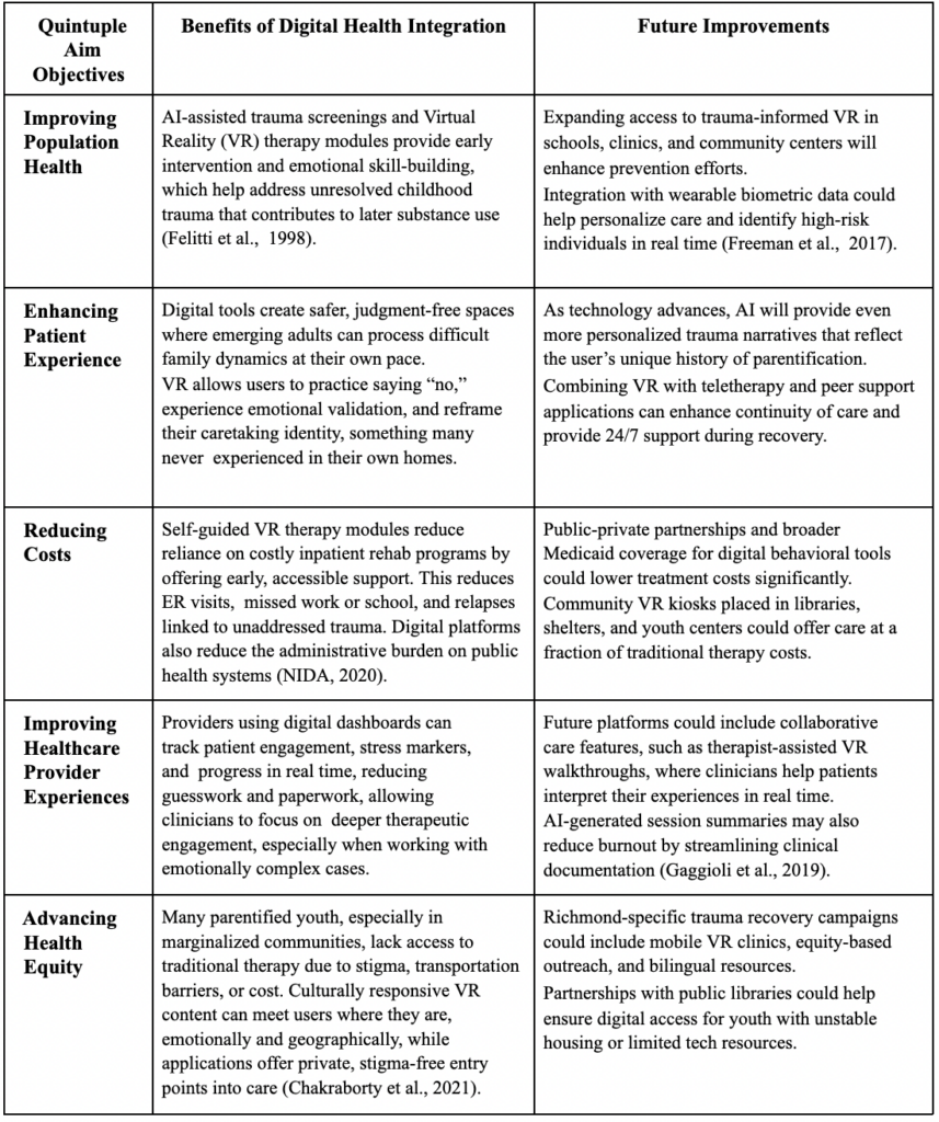 The Quintuple Aim framework, which emphasizes improving population health, enhancing patient experience, reducing costs, improving provider experiences, and advancing health equity, offers a powerful foundation for reimagining approaches to substance abuse, particularly in emerging adults affected by parentification in Richmond (Berwick et al., 2008; Nundy et al., 2022). Digital health technologies have substantial potential in improving population health by enabling early identification of parentified youth before patterns of substance use become entrenched. Moreover, digital health interventions can dramatically enhance patient experience for emerging adults navigating substance abuse and unresolved family trauma through virtual visits and telehealth services, tools which provide confidential, judgment-free environments for individuals with a fear of stigma or family obligations (SAHMSA, 2023).